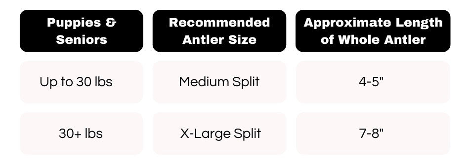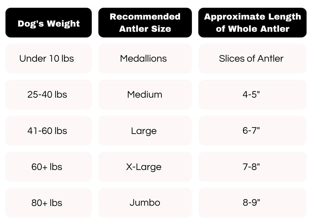 Antlers are excellent for cleaning your dog's teeth; one antler will make a dramatic difference in removing years of plaque & tartar build up! Antler is 100% natural and full of nutrition providing a healthy source of calcium and essential minerals. North American Antler is long lasting and, when the proper antler size and strength of antler is selected, it should last 4-6 weeks and, sometimes months! Antlers are also low calorie and are perfect for dogs with allergies or stomach sensitivities. Please use this chart when purchasing our antler: